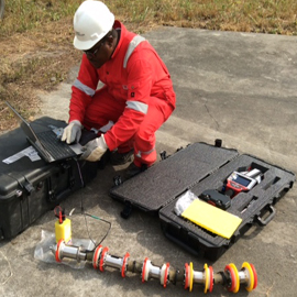 An Engineer downloading data from the Intelligent Pig minutes after recovery from the Addax receiver barrel in Izombe